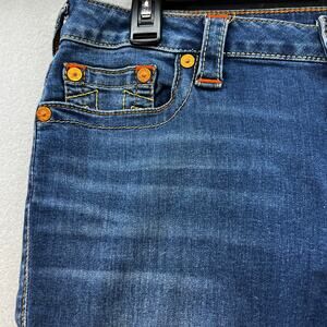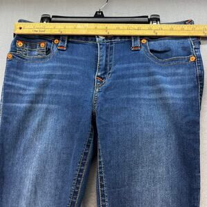 True Religion Women's Denim Jeans. Blue in color. Medium denim wash. Tagged size 33 (16). These women's True Religion jeans feature a five pocket design, a skinny leg logo embroidered pockets and a low to mid rise fit. Style number 49478-00. In preowned condition with minimal signs of wear.