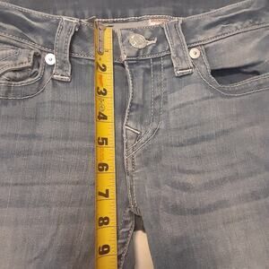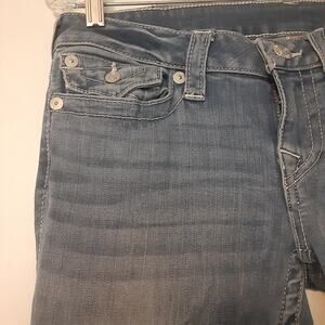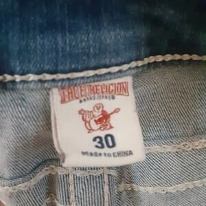 This product is a pair of True Religion women's jeans in size 30, featuring a skinny style with a solid blue color and whisker detailing. The jeans have a comfortable stretch fit and are made from a cotton blend material. They are designed with flap pockets and a zip and button closure for a stylish and practical wear. Perfect for a fashionable and comfortable look, these jeans are a versatile addition to any woman's wardrobe.