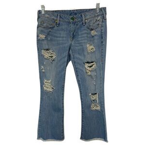 • Details: Heavy distressing/rips throughout, cropped hem, bell bottom flare