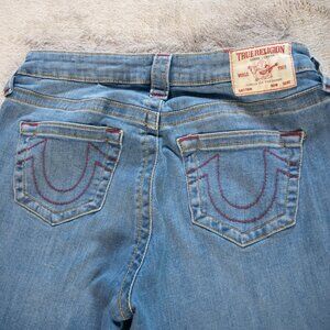 Unique Features: Raw unfinished hem, signature True Religion back pockets, slight stretch for curve fit, light fading and whiskering