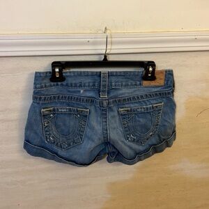 These are women's cuffed, blue jean shorts with side button details, a low-rise style with flap back pockets featuring the signature True Religion horseshoe stitching.