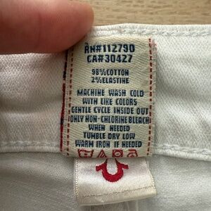 Classic True Religion “Joey” jeans in crisp white stretch denim. Low-rise bootcut with signature flap back pockets and branded rivet/button details. 98% cotton with a touch of stretch for a flattering fit. Made in USA.