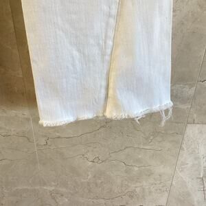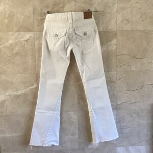 True Religion Joey jeans, size 27, in a rare white wash with tonal stitching and signature twisted outseam. Low rise waist, dramatic flare leg with frayed hems, and iconic back flap pockets with engraved button detail. Brown leather patch confirms authenticity. Excellent used condition—no stains, snags, or fading. Retail $179