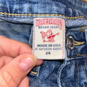 The jeans feature logo accents, pockets, and a waist size of 24 inches. They have a regular fit and a 29-inch inseam. The True Religion Joey jeans are perfect for any occasion and can be dressed up or down.