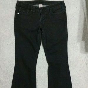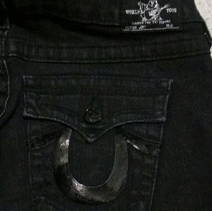 Nice preowned True Religion Joey Sequin Pocket logo flare leg jeans in good condition. Minor flaw is the light stain on the zip area (last photo ).