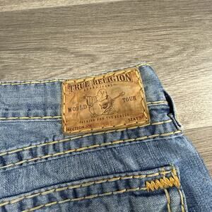 The True Religion Joey Super T Bootcut Jeans for men in size 38x30 feature a big stitch detail on the pocket, adding a unique touch to the classic denim style. These vintage-inspired jeans from the 2000s have a mid-rise fit with a bootcut leg, offering a comfortable and stylish option for everyday wear. Made from 100% cotton denim, these jeans are easy to care for and have a five-pocket design for added convenience. Perfect for all seasons, these True Religion jeans are a timeless addition to any wardrobe.