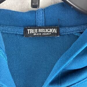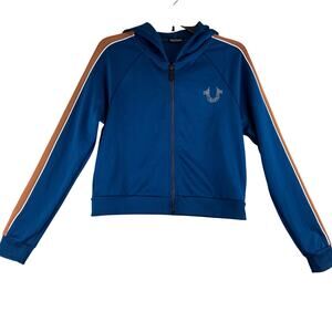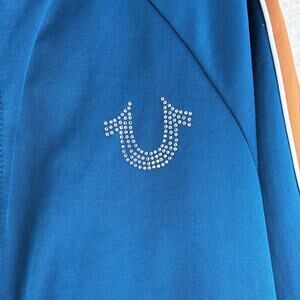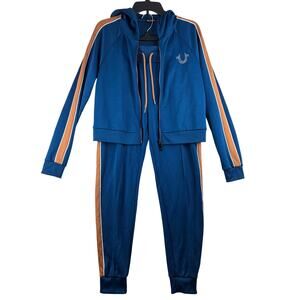 Get ready to sparkle in this True Religion jogger tracksuit! This stylish sweatsuit features a full zip hoodie and matching jogger pants, both in a beautiful blue with a subtle sparkle logo. Perfect for adding a touch of glam to your casual wear.