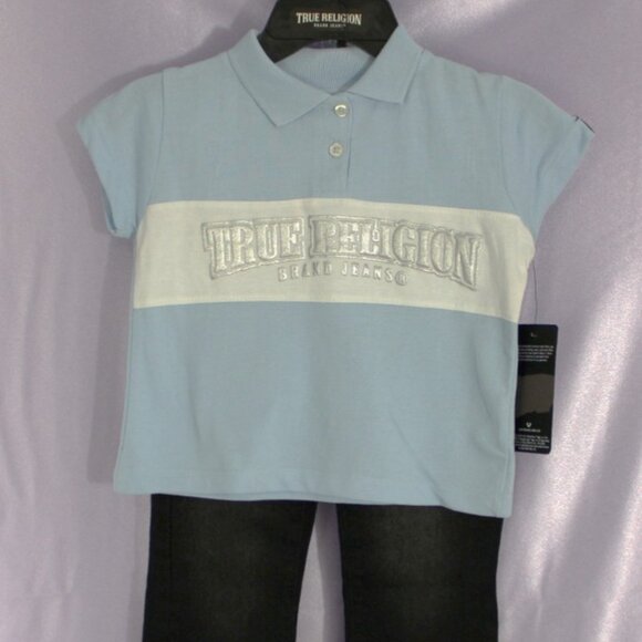 New with tags True Religion Brand Jeans kids two-piece outfit set featuring a baby blue short sleeve polo shirt with white stripe panel and raised embroidered True Religion logo across the chest, paired with black pants with signature True Religion stitching on the back pockets. This stylish designer set is perfect for casual wear, school, special outings, or gifting. Both pieces are brand new with original tags still attached and have never been worn.