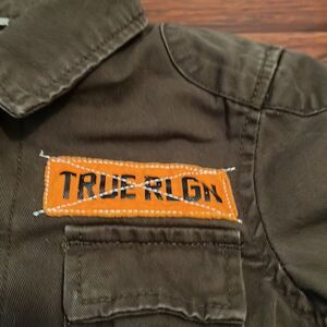 True Religion Kids Military Green Distressed Camouflage Sleeves Print Button Closure Jacket. Size 4, pockets in the front, factory distressing style.