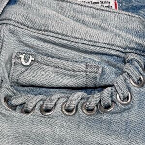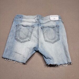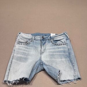 Stylish light blue jean shorts. Features frayed hem and unique pocket design. Perfect for casual wear. Inseam 5” These jeans were made into shorts