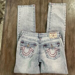 True Religion Light Blue Straight Leg Jeans with red stitching
