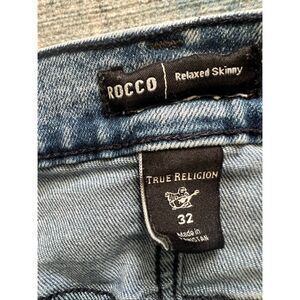 Distressed Rocco jeans from True Religion. Rips and holes, and fading throughout. Zip fly, classic 5 pocket styling, and True Religion signature logo patch on back waistband. Relaxed skinny fit.