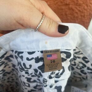 True Religion Liv Relaxed Boyfriend White Cheetah Print Jeans Zip Size 26 FLAWED