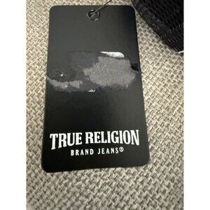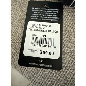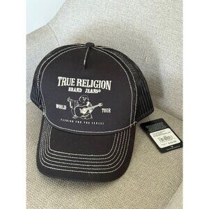 True Religion Logo Buddha Black Snapback Trucker Mesh Hat Cap White Stitching NWT