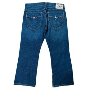 This product is a pair of True Religion men's blue jeans in size 38, featuring a mid-rise fit with a bootcut style and 5-pocket design. The denim fabric is accented with the brand's logo and is made of cotton. These jeans have a zip closure, a 29-inch inseam, and a regular fit. They are from the True Religion World Tour product line and are machine washable for easy care. With detailed pockets in the back, these jeans are a stylish and versatile addition to any man's wardrobe.