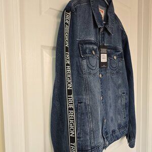 Brand new with tags men's True Religion Logo Taping Denim SN Jacket. Fabric is cotton/lyocell blend and the color is medium tide wash. It has multiple pockets, button closure, and size is large.