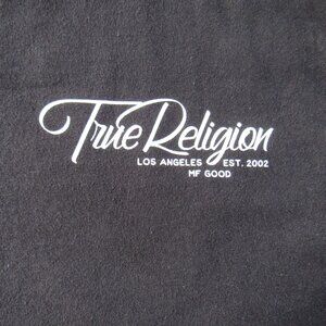 True Religion logo on the front chest and an array of puff print graphics on the back