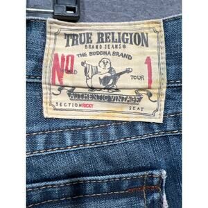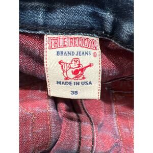 You are viewing a pair of True Religion Men's Ricky Distressed Straight Flap Jeans in size 38. These jeans feature a stylish distressed design and the iconic True Religion flap pockets.  They are perfect for adding a touch of edgy style to your wardrobe. Don't miss out!