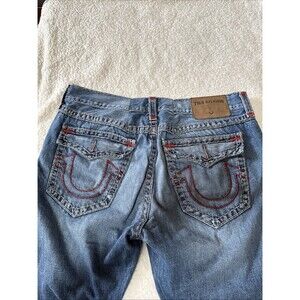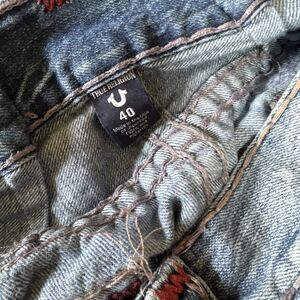 The product is a pair of True Religion Men's Ricky Relaxed Straight Jeans in size 40 with distressed red stitching. These jeans feature a zip closure, denim fabric, a mid rise, a straight style, and a relaxed fit. They also have a 5-pocket design, solid pattern, and are machine washable. With a waist size of 40 inches and an inseam of 33 inches, these jeans are a stylish and comfortable option for men's casual wear. Some wear and distressed look! See pictures!
