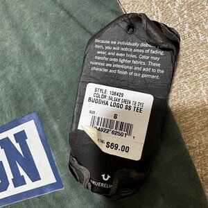 Elevate your streetwear style with this True Religion T-shirt featuring a buddha holding a guitar graphic. The 100% cotton fabric makes it comfortable for all seasons, while the balsam green tie-dye pattern adds a touch of casual and designer vibes. The crew neckline, short sleeves, and regular fit make it an ideal choice for men's casual occasions. This T-shirt is machine washable.