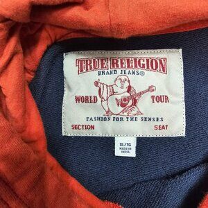 Stay comfortable and stylish with this True Religion hoodie and jogger set. Made from soft cotton, it features a striking navy and orange color combination. Pants are size large, hoodie size XL.