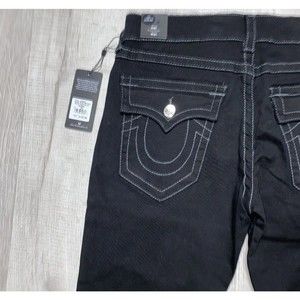 Elevate your denim game with these stylish True Religion jeans. The black denim fabric is accented with flaps and the brand's signature logo, giving it a designer touch. The relaxed straight fit and breathable fabric make these jeans comfortable for all seasons.