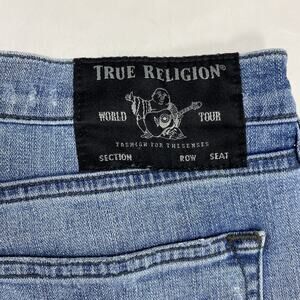 True Religion Mick Slouchy Skinny Jeans in light blue wash with heavy distressing. Features ripped knees, whiskering, and classic True Religion styling with signature stitching and leather back patch. Made in Mexico.