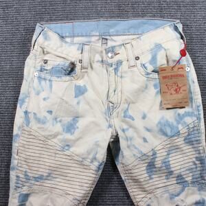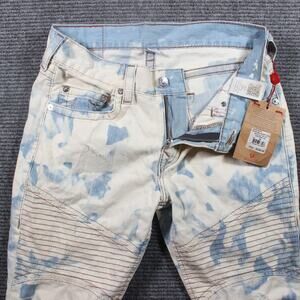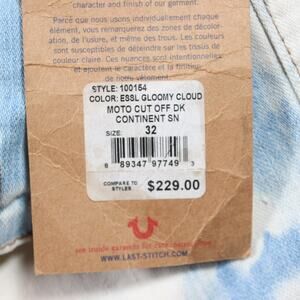 Standout True Religion moto cut-off denim shorts in the rare “Gloomy Cloud” wash (style 100164 / ESSL). Heavy ribbed moto panels, raw hems, and intentional destruction give these a premium biker look. New with tag (MSRP $229).