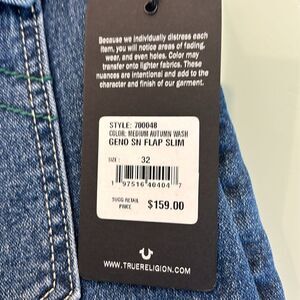 True Religion NWT jeans 32 GENO an flap relaxed slim dark blue wash faded lot’s of stretch $159