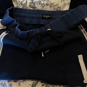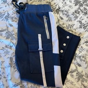 Heavy cotton material. 4 pocket pants. Two front pockets at hip zip closed, one utility pocket in the front snaps closed and one back pocket with true religion emblem. 3 snaps and bottom of pant do work to open up leg for ski boots etc...