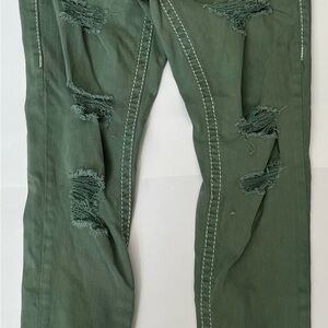 Chic olive high rise jeans with distressed details. Ideal for casual outings.