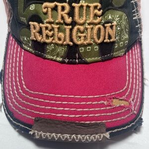 Vibrant True Religion cap with patchwork design. Features bold red and green accents. Distressed Designed details add character. Preowned, great condition.