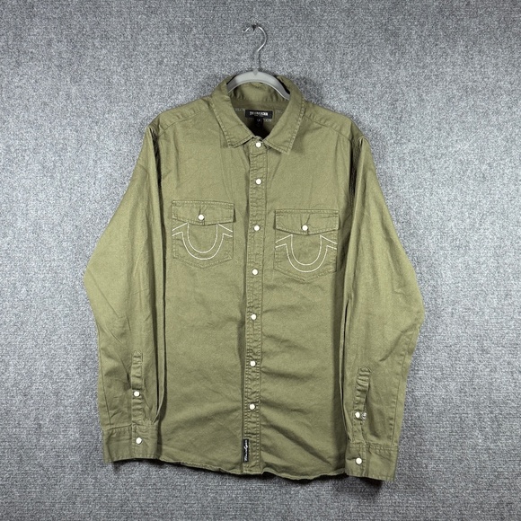 True Religion Pearl Snap Olive Green Long Sleeve Button Down Shirt Mens Medium