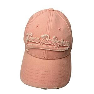 True Religion Pink Hat Spell Out Logo Baseball Cap Distressed Trucker Strapback