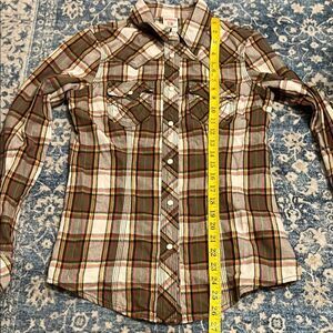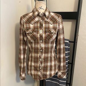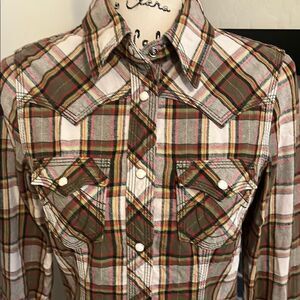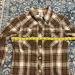 True Religion Plaid Pockets Button-Up Western Cowgirl Boho Festival Concert Multicolor Shirt, size small.