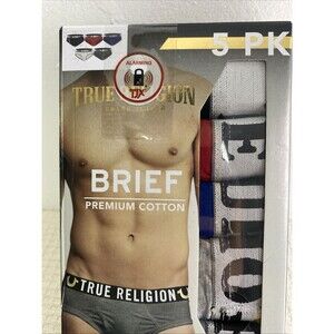 The True Religion Premium Cotton Briefs in size M for men feature a classic solid design with a logo waistband in assorted colors of red and blue. Made from 100% premium cotton knit fabric, these underwear are machine washable and lightweight, offering comfort and breathability. The 5-pack includes brief style underwear with a tagless design and stretch fabric, perfect for all seasons wear. Created by the brand TRUE RELIGION, these premium cotton briefs are a stylish and high-quality addition to any man's underwear collection. Multicolor, see pictures for more details.