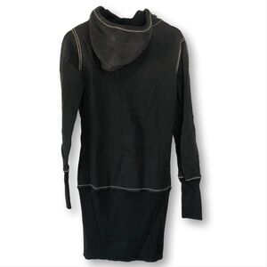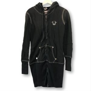 True Religion long-sleeve hoodie dress with a rhinestone horseshoe logo and ribbed details. Full zip.