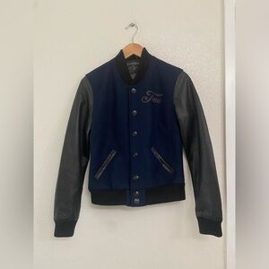 Fitted varsity jacket with navy wool center and leather contrast sleeves