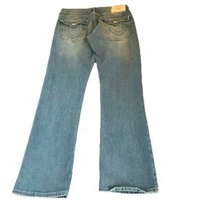 These True Religion Ricky men's jeans feature a classic straight leg style with flap pockets for added detail. While the tag size is 31, these jeans measure 33x333. Made from a comfortable cotton blend denim, they have a medium wash and a relaxed fit perfect for year-round wear. The iconic True Religion logo accents the design, while the mid-rise waist (10 in) and the logo accented zip and button closure ensure a quality construction. The flat ankle opening is about 8 inches. Easy to care for with machine washable instructions, these jeans are a stylish choice for any man's wardrobe.