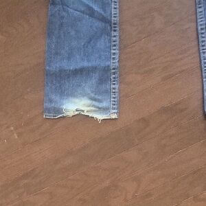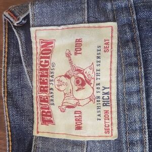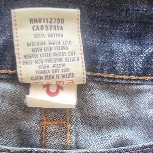 These True Religion jeans feature a classic straight cut in a timeless blue hue, offering a vintage-inspired look with their worn-in aesthetic. The light to medium blue wash and subtle fraying at the hem add character, making them a versatile choice for casual outings.
