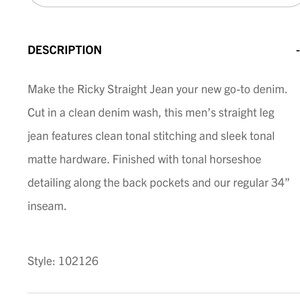 Make the Ricky Straight Jean your new go-to denim. Cut in a clean denim wash, this men’s straight leg jean features clean tonal stitching and sleek tonal matte hardware. Finished with tonal horseshoe detailing along the back pockets and our regular 34” inseam.