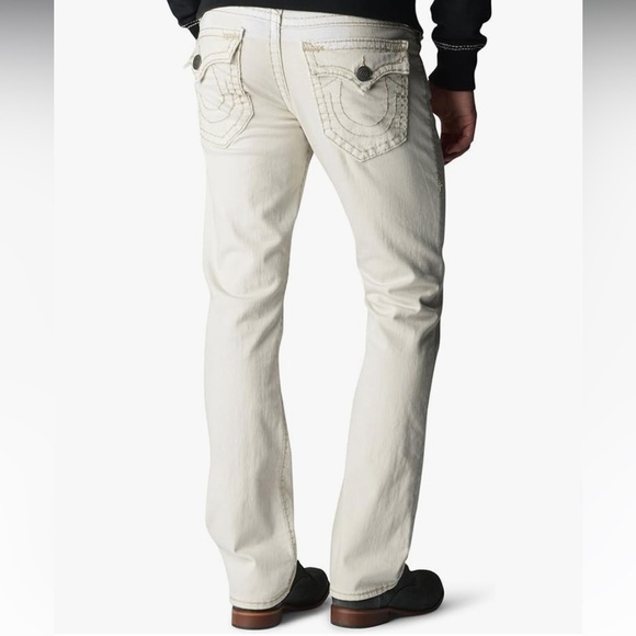 Experience the perfect blend of style and comfort with these True Religion cream jeans. Crafted from soft, washed denim, they offer a relaxed fit ideal for casual outings. The signature horseshoe stitching adds a touch of iconic flair to your wardrobe.