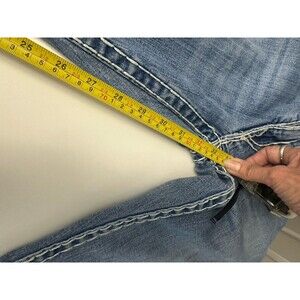 The True Religion Ricky Super T White Stitch Jeans are a rare and stylish pair of men's denim jeans in a medium wash. These jeans feature a zip closure, low rise, and a straight fit. The design includes studded accents, branded buttons and zippers, and a 5-pocket design with belt loops and pockets for added functionality. Made of cotton denim, these jeans are machine washable and perfect for all seasons. The solid blue color and American craftsmanship make them a unique and fashionable choice for any occasion. They say 32X34 but the measure 32X33.