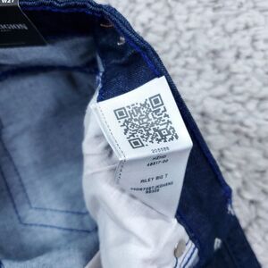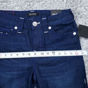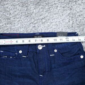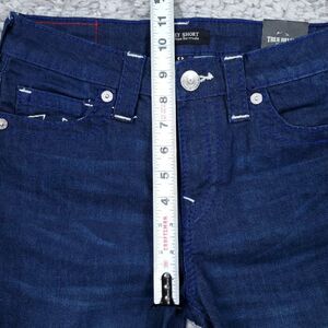 Women's True Religion Riley Big T Raw Hem Mid Rise Bermuda dark wash blue "Dark Moonstone" stretch denim jean shorts. Raw or cutoff hem. New with tags. Women's size 27, real measurements shown in photos with shorts laid flat: