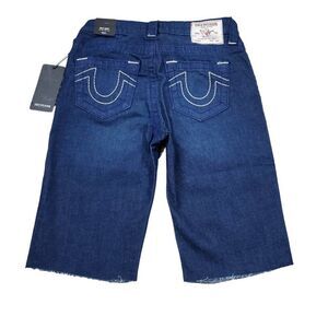 True Religion Riley Big T Raw Hem Mid Rise Bermuda Jean Shorts Dark Wash Size 27
