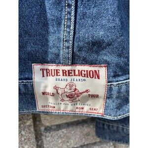 The True Religion Sherpa Collar Denim Blizzard Wash Western Trucker Jacket in size Large is a stylish and versatile outerwear option for men. Made from a durable cotton blend denim fabric in a solid blue color, this jacket features a spread collar, button closure, and long sleeves, making it suitable for casual, workwear, or travel occasions during the winter, fall, or spring seasons. The retro 80s and 90s cowboy American Western theme adds a touch of flair to the jacket, making it a standout piece in any wardrobe. With its regular fit, this True Religion jacket is both comfortable and practical for everyday wear.