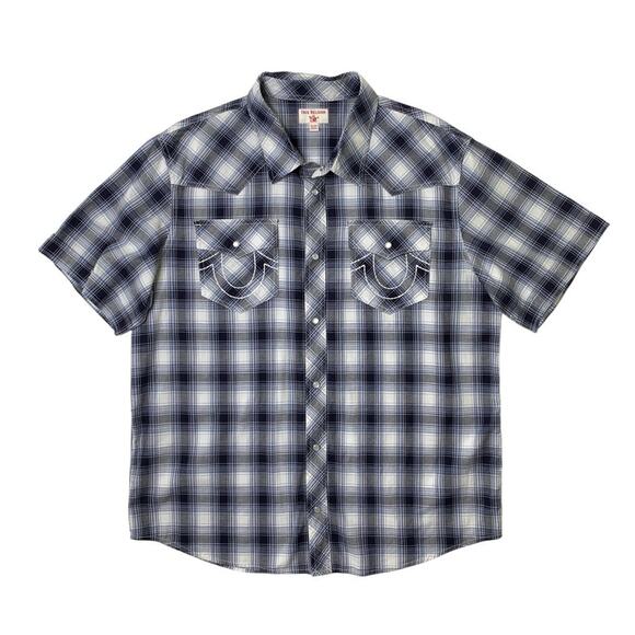 TRUE RELIGION SHIRT MENS 2XL NAVY WHITE COTTON WESTERN YOKE PLAID PEARL SNAP
