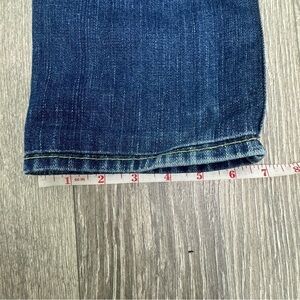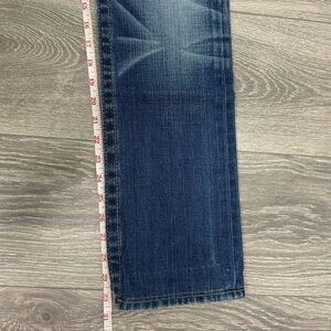 Details: Comes in a medium dark denim wash and minor distressed back pocket design. Design extends to above pockets. Has light factory distressing on front of jeans. Jean had been hemmed.