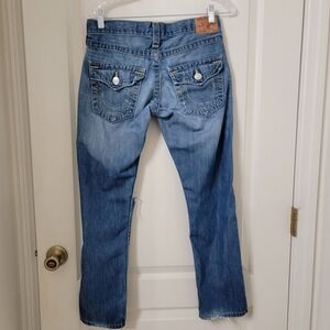 True Religion Size 25 Blue Jordan Y2K Flap Pocket Distressed/Destroyed Jeans. Used Condition, Wear on Knee and Hemline. Factory Fading, Whiskering and Distressing. Flap Pocket with Button Closure. Front Button Fly Closure. No Pulling or Puckering at Crotch Area. Please refer to measurements in photos to ensure proper fit.