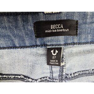 The product is a pair of True Religion Becca Mid Rise Bootcut Blue Denim Jeans in size 27X34 for women. These jeans feature a classic 5-pocket design with a mid rise and a bootcut style, making them versatile for various seasons. The fabric wash is medium, the material is a blend of polyester, spandex, and cotton, and the brand is True Religion. These jeans are machine washable and have a regular fit, perfect for everyday wear. The logo accents add a stylish touch to these jeans, showcasing the brand's signature look.